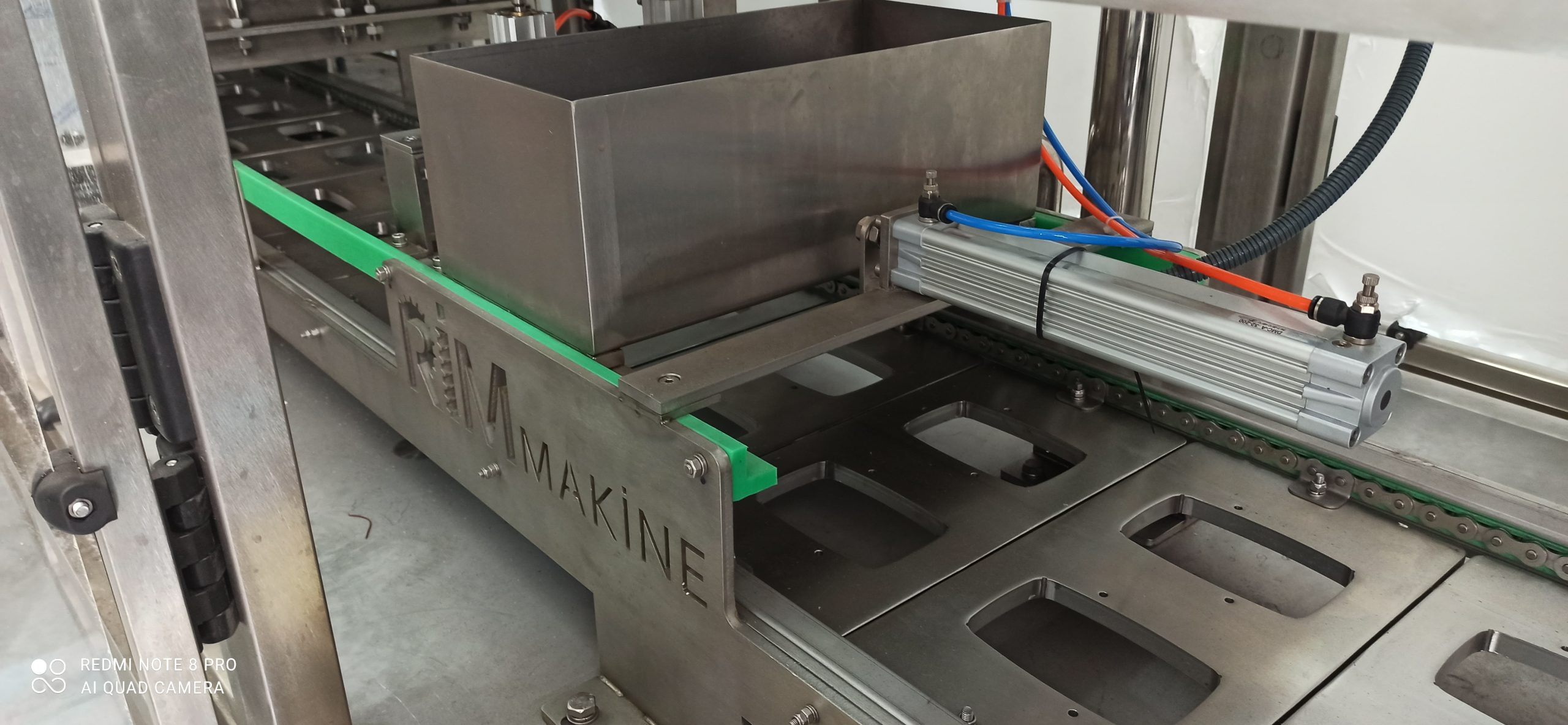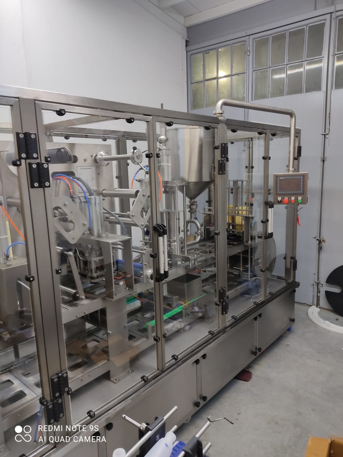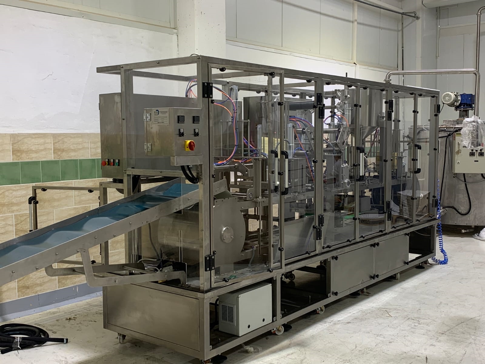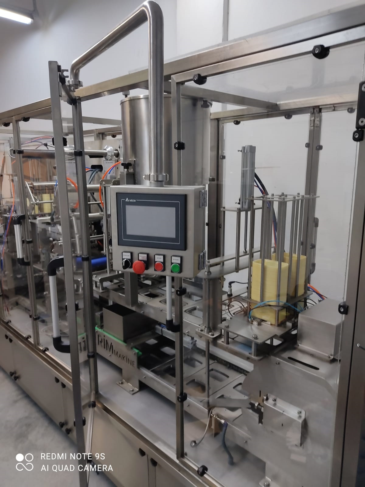 Made of stainless steel 316 for the surface with direct contact with food -50 liter Vessel and cover along with other parts that are in direct contact with food is made of 316L stainless steel. – Product feeding to 50 Liter vessel is done automatically via sentry pump . -Product type : Labaneh , margarine , Hommus, soft cheese . – working Liner steps filling 1. machine takes empty container 2. UV light for sterilization of the empty cups. 3. product fill inside container 4. plyled /aluminum covers sealing 5. but PVC cover on cup top 6. Final products via Exit Conveyor. – container volume up to 150-500 gm , Square plastic cup – 2 piston Fillers . – There are safety sensors to check the existence of plastic container. -PLC control system with touch screen.. – Working capacity depending on 1000-1200 piece/hour -Power: 3 PH x 380V – 50Hz – Motor type : Turkish made motor -Pneumatic parts: EURO/Taiwan \Turkey – Electrical parts are EURO, Turkey made